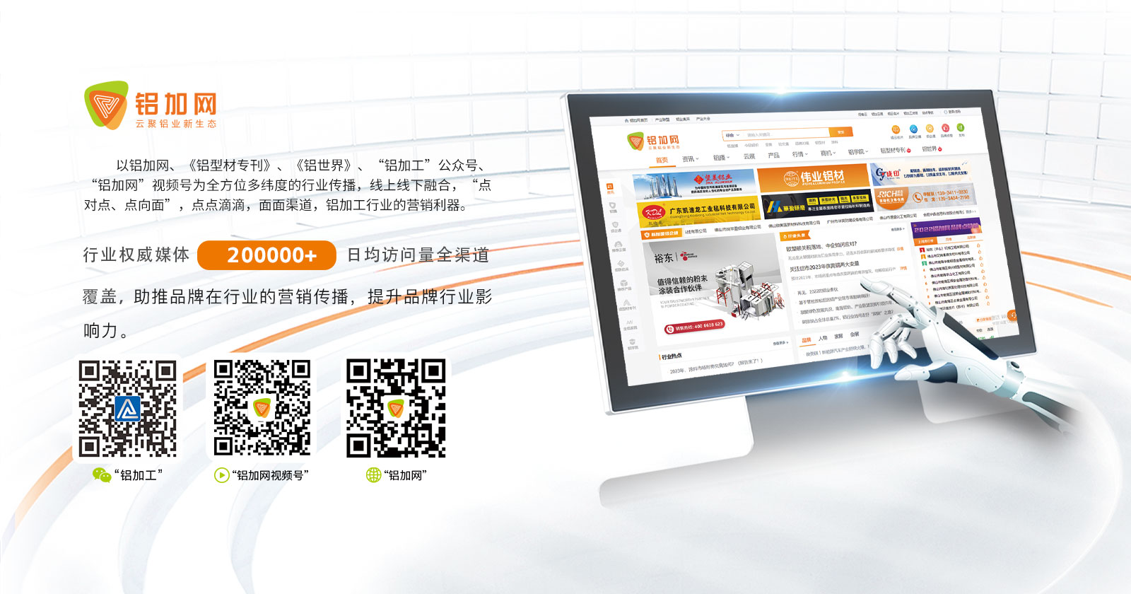 鋁加網(wǎng)(www.albiz.cn)是聞名鋁加工行業(yè)的垂直門戶網(wǎng)站,云聚鋁業(yè)新生態(tài),構(gòu)建鋁業(yè)新場(chǎng)景,以albiz.cn 網(wǎng)站為核心,以移動(dòng)云端、鋁加工微信、鋁加網(wǎng)視頻號(hào)、《鋁型材??泛汀朵X世界》雜志為載體,成為了鋁加工行業(yè)資訊和精準(zhǔn)傳播的首選傳媒。鋁加網(wǎng),采集和發(fā)布全行業(yè)信息資訊,提供線上展覽、在線直播、短視頻、品牌策劃、品牌運(yùn)營、品牌傳播等全方位的專業(yè)服務(wù)。